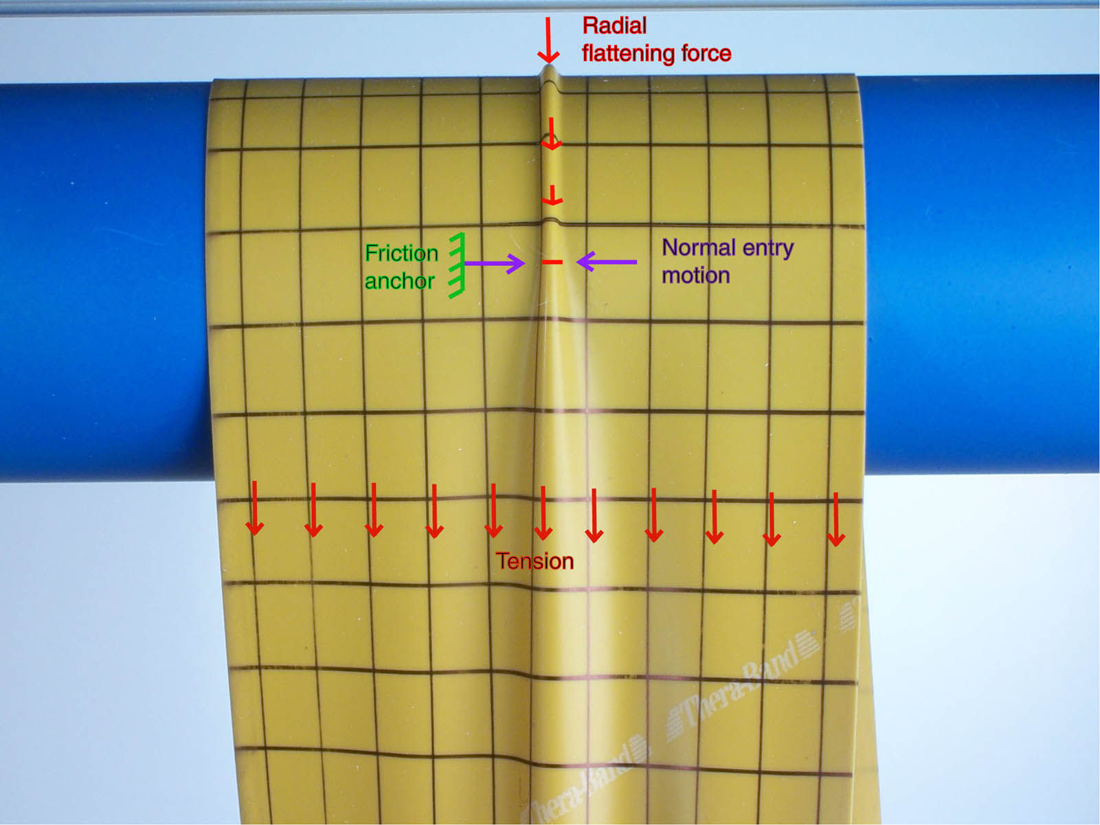 Anatomy of a Wrinkle AIMCAL 2008 PowerPoint Paper PowerPoint_with_notes In this paper, each step of wrinkle formation is studied using stop-motion photography. This is done on a lab machine specially constructed for this type of study. The machine can handle a latex web operating at large strains, so that the web deformation may be directly observed. It can also be run at very slow speed for observation and then stopped gently for photos. |